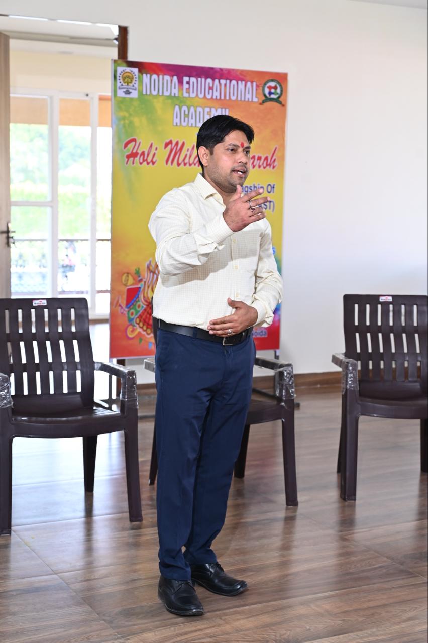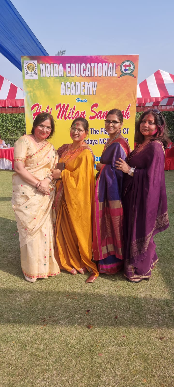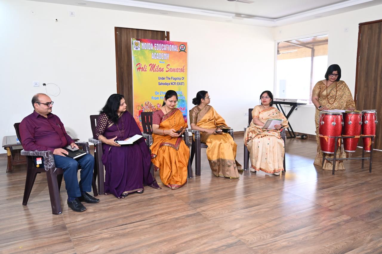 Description : Noida Educational Academy hosted the Holi Milan Samaroh, under the flagship of Sahodaya NCR (East), on March 21st 2024, at Pushpanchal Farms in sector-130, Noida, Directors, Principals and Teachers from 85 CBSE Schools in NCR East participated in this event. With a vibrant and melodic welcome, attendees gathered to celebrate the occasion under the esteemed leadership of Mr. Naveen Tyagi, Director of Noida Educational Academy, and Ms. Deepa Bhatt, Principal of Noida Education Academy. The day's proceedings commenced with an enlightening address by Mr. Sandeep Mittal, Director of Alpine group, setting a reflective tone for the event. Mrs. Deepti Sharma President of Sahodaya NCR East given introductory note further set the stage for engaging discussions and activities. A panel discussion on the National Credit Framework, moderated by Dr. Asha Sharma, Principal of Sainthood Convent School, Dadri, provided valuable insights and perspectives. The convergence of brilliant minds, including panelists such as Ms. Smita Mishra Principal Karl Huber School Noida,Ms. Gunjan Bansal Principal Divine Mother International School, Ms.Deepti Sharma Principal Pragyan Public School and President of Sahodaya NCR East ,Dr. Mrinalini Singh Principal Yadu Public School and Mr. Vinay Kumar Jha Principal fostered insightful conversations and meaningful exchanges throughout the day. These discussions contributed to strengthening the educational ecosystem in our region, paving the way for future collaboration and innovation. Holi Milan Samaroh at Noida Educational Academy brought together hearts with colours of love , laughter and togetherness. Ms. Gunjan Bansal's Secretary NCR East presentation on the Sahodaya events calendar for the year 2024-25 offered attendees a glimpse into upcoming educational activities. The audience had the privilege of hearing a speech by Prof. Mr. Sanjay Goel, the Vice Chancellor of Jaypee Group, adding academic depth to the event. Cultural activities, including a vibrant group dance performance by the host school, showcased the talent and energy of the students. Fun and games, such as Musical Chairs and the Color Game, fostered a sense of camaraderie among attendees, enhancing the overall experience. Ms. Harvinder Kaur concluded the event with a heartfelt vote of thanks, expressing gratitude to all participants for their valuable contributions. A group photo captured the memorable moments shared during the event, serving as a cherished keepsake for all involved. The celebration continued with Holi Milan and lunch, further fostering bonds and camaraderie among attendees. "Ms. Reeta Sharma gracefully anchored the Sahodaya Holi Milan Samaroh, ensuring a seamless event experience." The festivities concluded with the joyful celebration of Holi, accompanied by remarkable music performances by the children of Noida Education Academy,marking the culmination of a day filled with knowledge, camaraderie, and vibrant celebrations. It was truly a day filled with knowledge, fun, and vibrant celebrations, embodying the spirit of #SahodayaHoliMilanSamaroh and #EducationalExcellence.